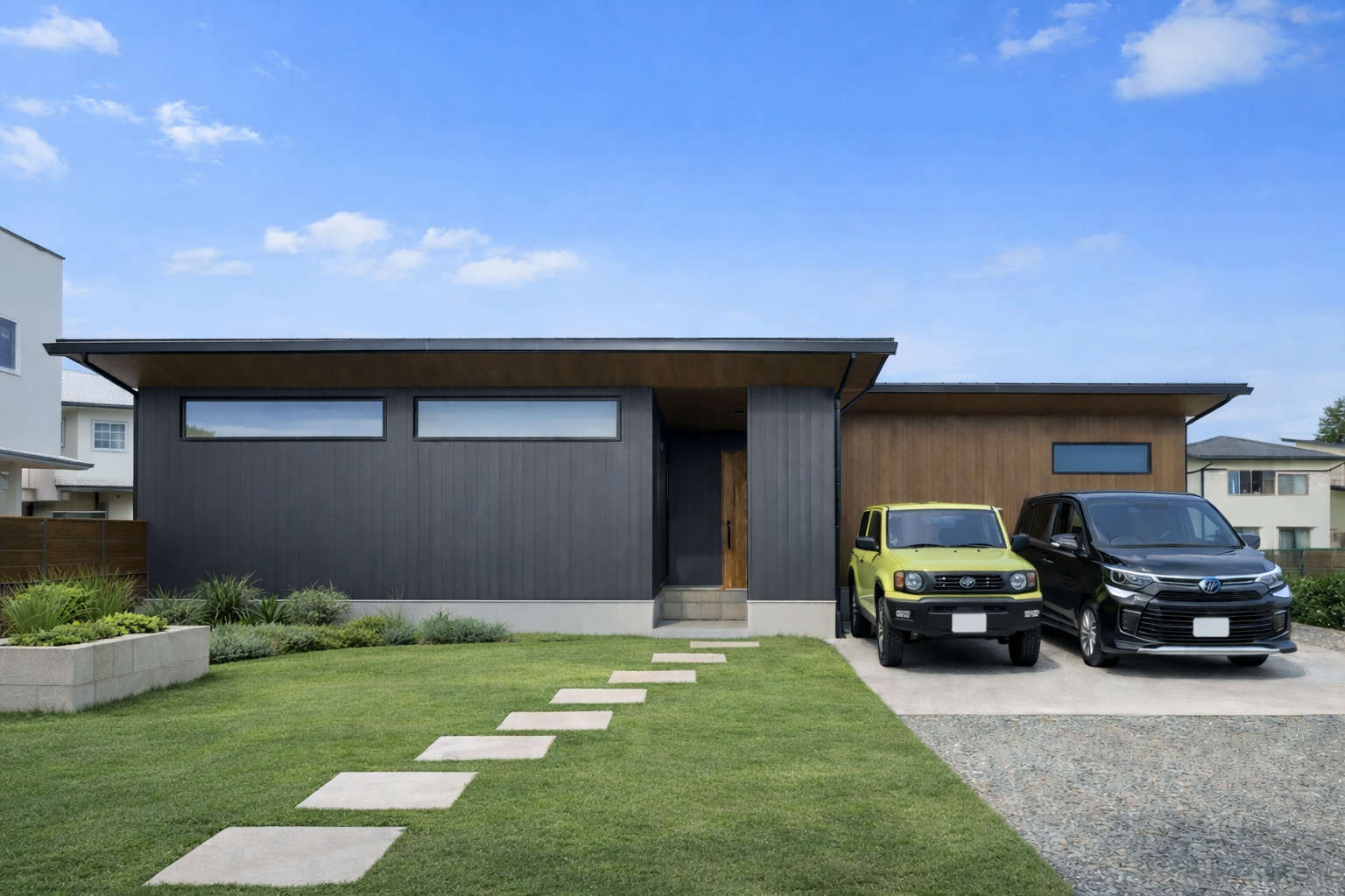 ガレージ付きの外観は黒と木目でスタイリッシュに。 中に入れば柔らかい色合いが迎えてくれる、和モダンな空間。