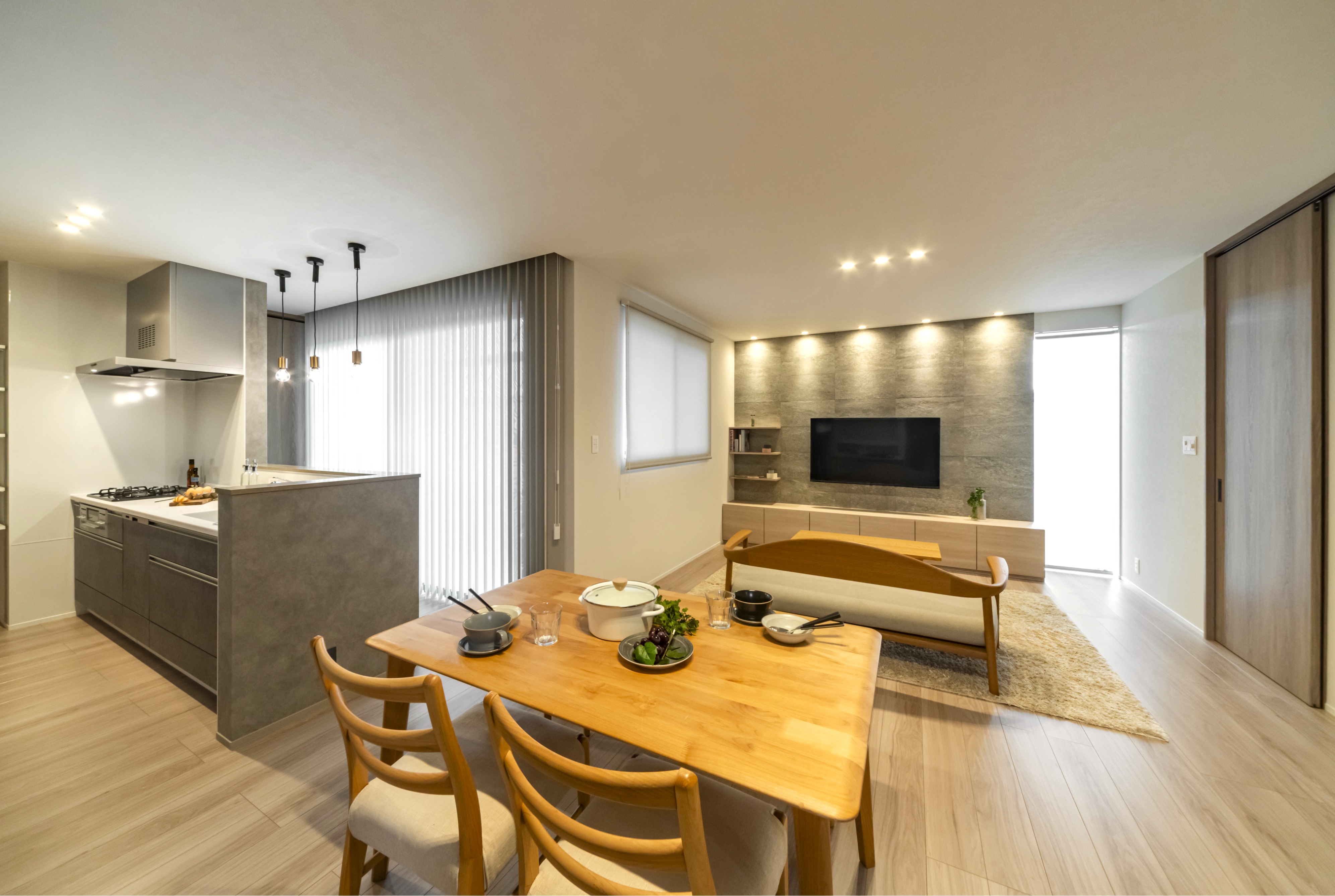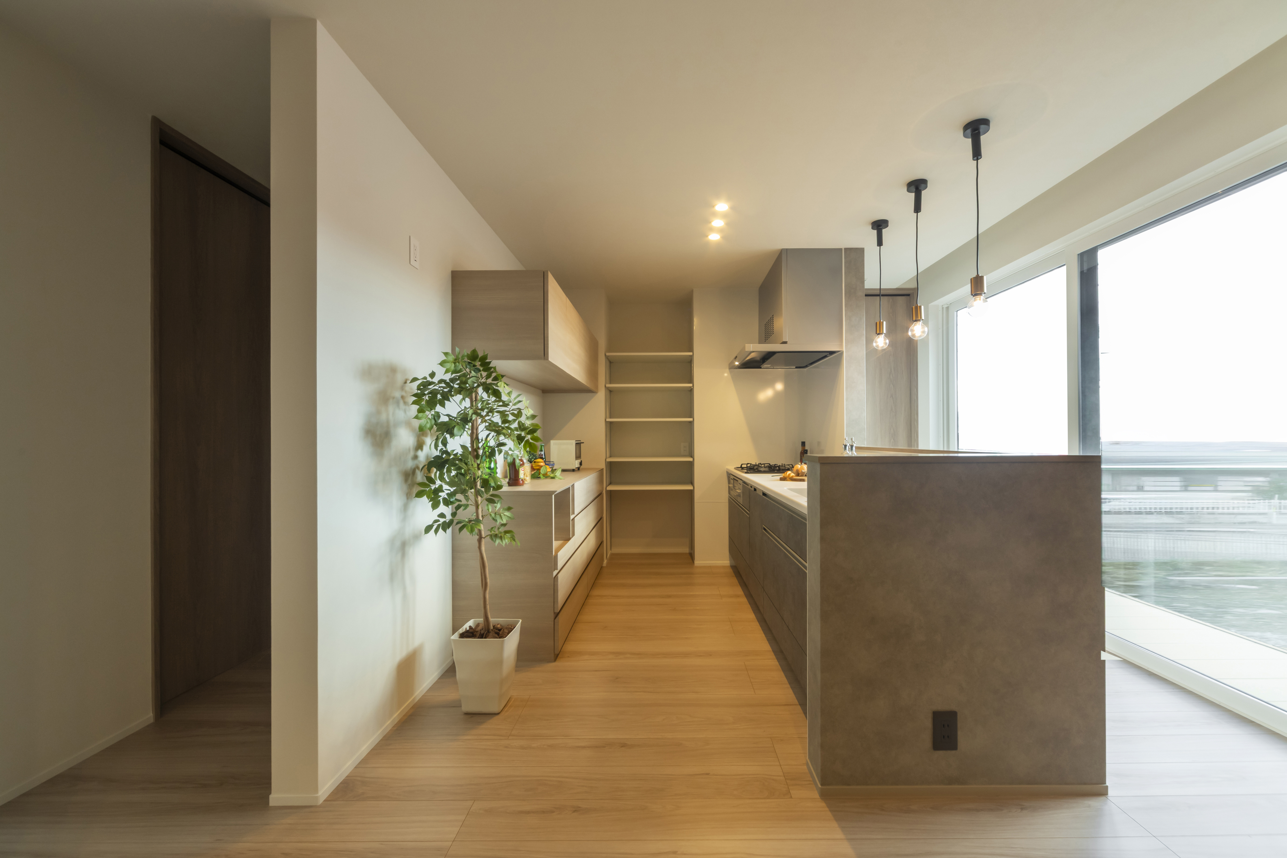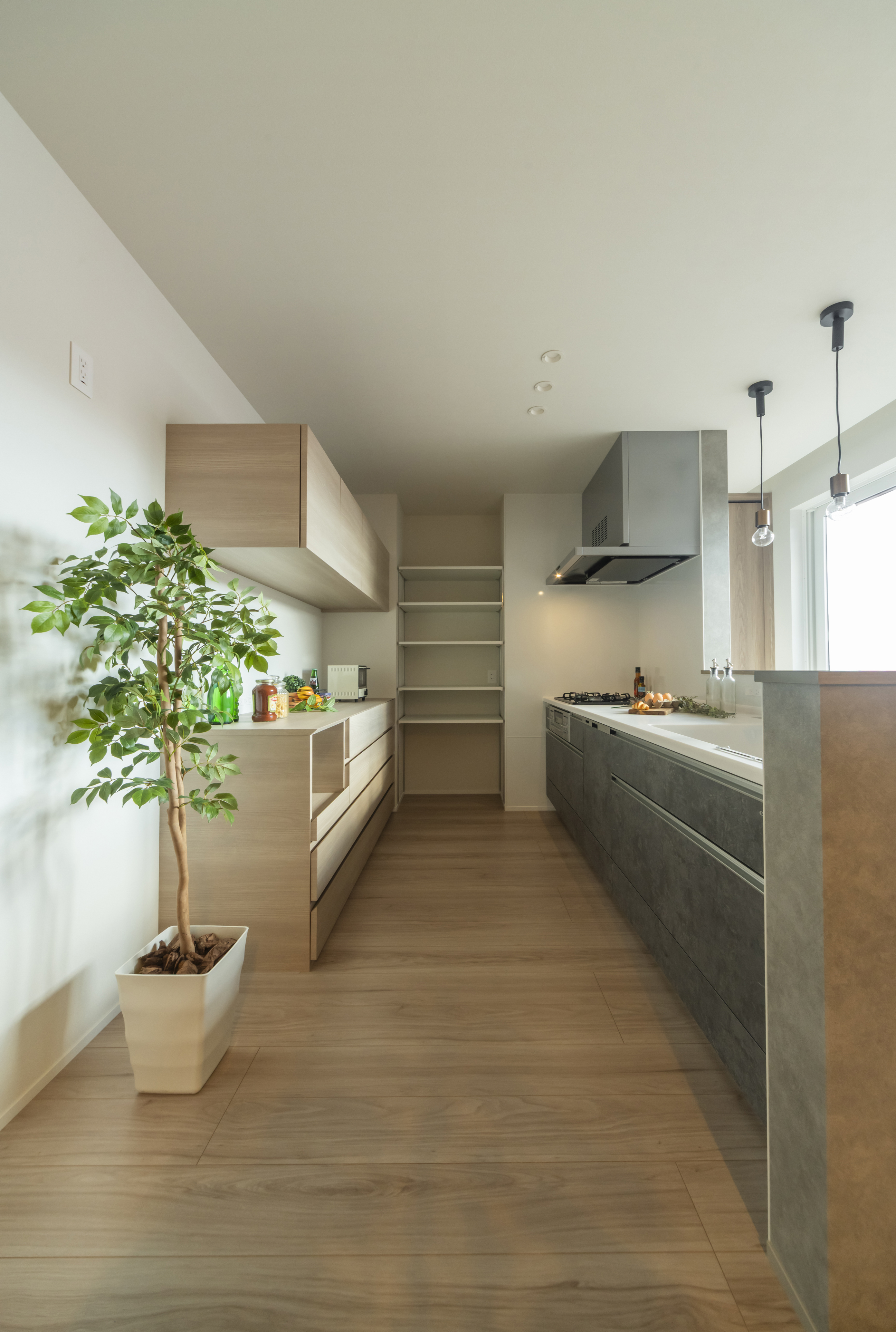 水まわりの家事ラク回遊動線を叶えた2階建ての家。1階だけで生活を完結できる設計です。 キッチンから、リビングダイニングに加えお庭まで見渡すことができ、家族の笑顔をいつも近くで見守ることができます。